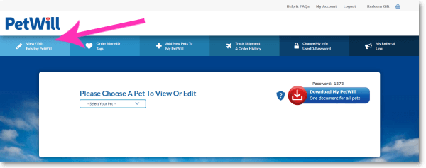 5. You may be automatically taken to the VIEW/EDIT EXISTING PETWILL section of your account.